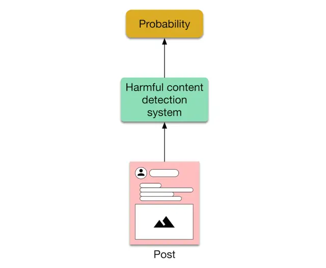 Once we decide on the ML objective, we need to define the system’s inputs and outputs. For example, for a harmful content detection system on a social media platform, the input is a post, and the output is whether this post is considered harmful or not.