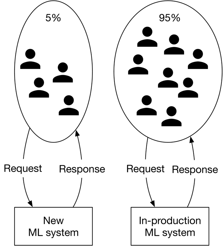 The only way to ensure the model will perform well in production is to test it with real traffic. Commonly used techniques to test models include shadow deployment [41], A/B testing [42], canary release [43], interleaving experiments [44], bandits [45], etc.