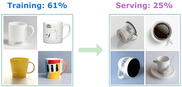 Data distribution shift refers to the scenario in which the data a model encounters in production differs from that it encountered during training. Figure 1.24 shows an example where the training data comprised images of cups seen from the front view, but at serving time, an image of a cup at a different angle is passed to the ML model.